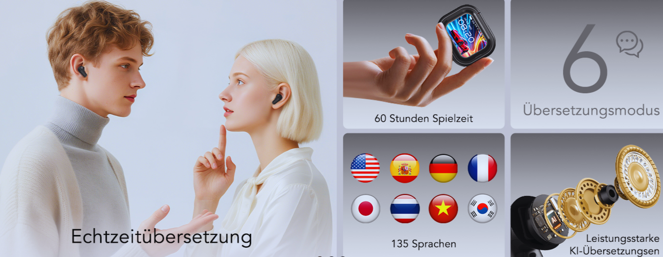 🎧 Intelligente Technologie, intuitiv gesteuert6 smarte Übersetzungsmodi, Bluetooth 6.0, Touchsteuerung und aktive Geräuschunterdrückung sorgen für nahtlose Verständigung und perfekten Hörgenuss – ganz ohne App-Wechsel.